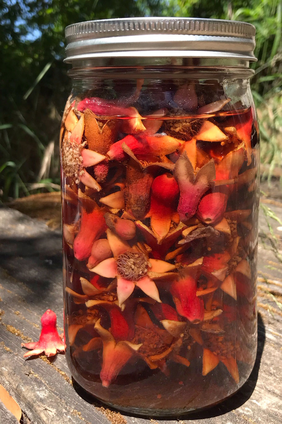 Using a glass jar I filled to almost the top with the small fruits and covered with water. That's it. The jar sat mostly in the sun for 10 days. I probably could have used it a few days earlier because it was very hot and sunny. You'll have to experiment with how long you are able to have it in the sun.